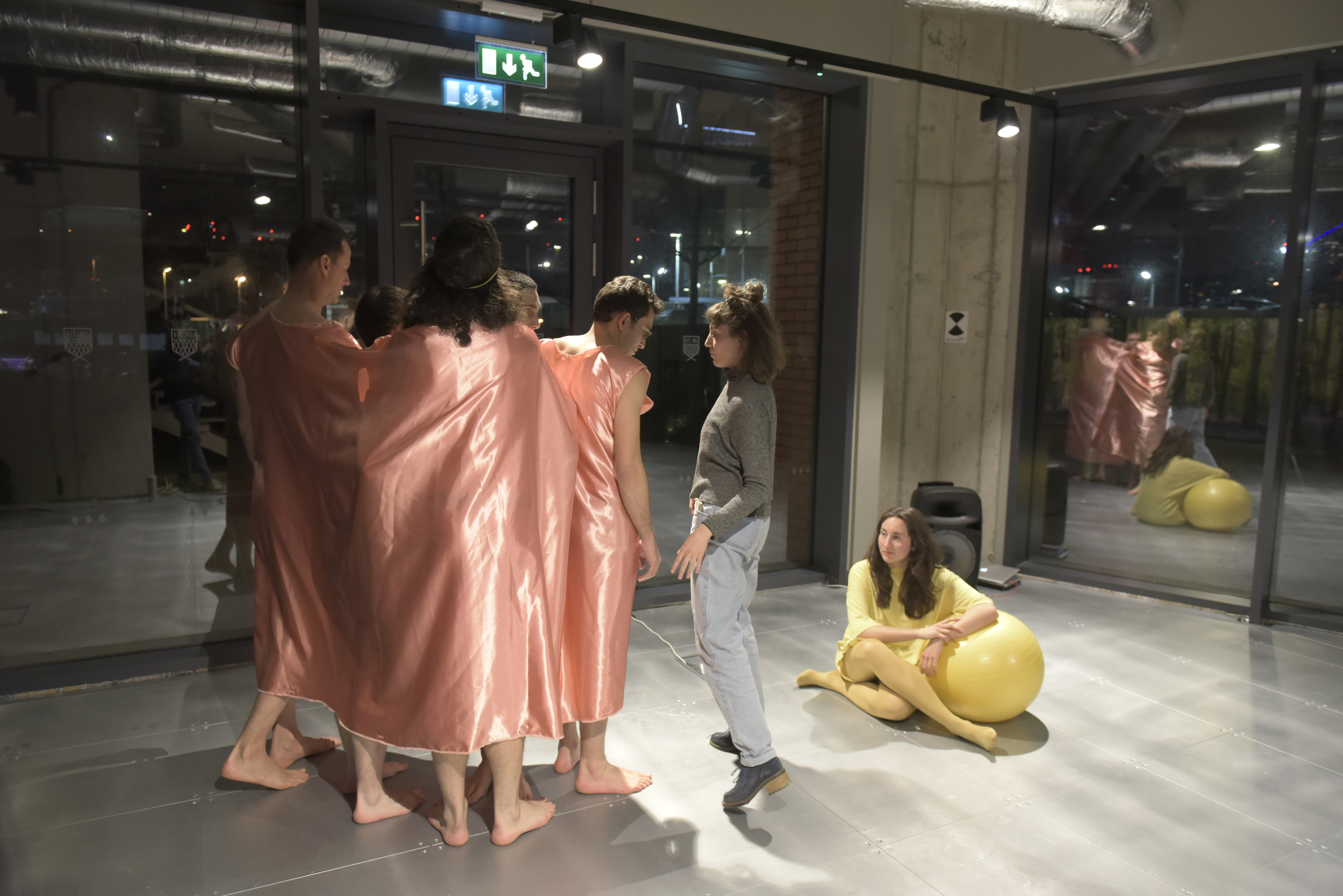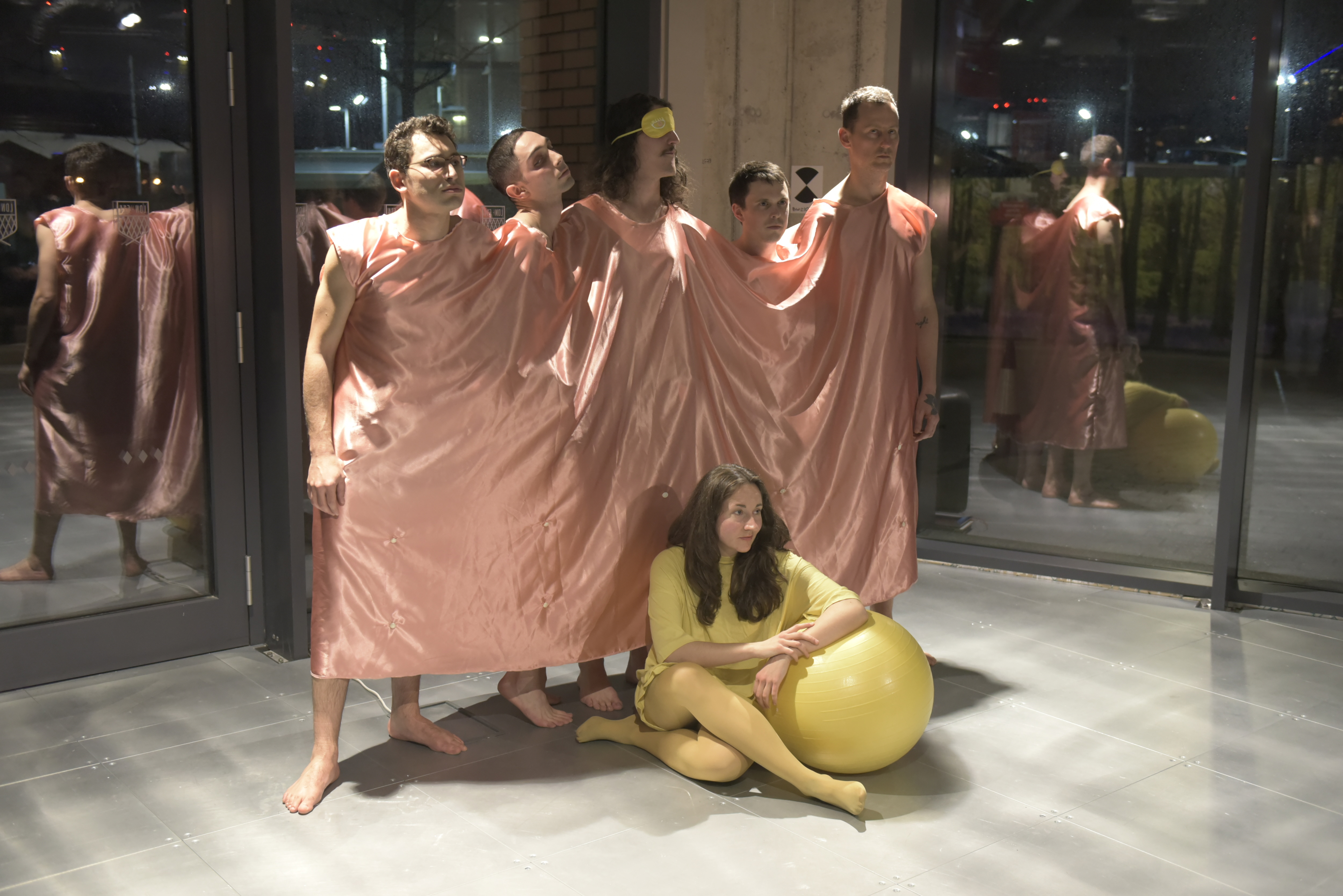 | The performance piece has two main layers. Firstly, a creature – performed by five men of different heights, wearing a satin fabric costume, and naked underneath – is trying to move as a unit, oddly circling the gallery space. A bored sun is moving a big yellow Pilates' ball, illustrating sunset and sunrise movements. From time to time, the sun gets bored with the routine of the universe, while the creature is struggling to keep on moving.