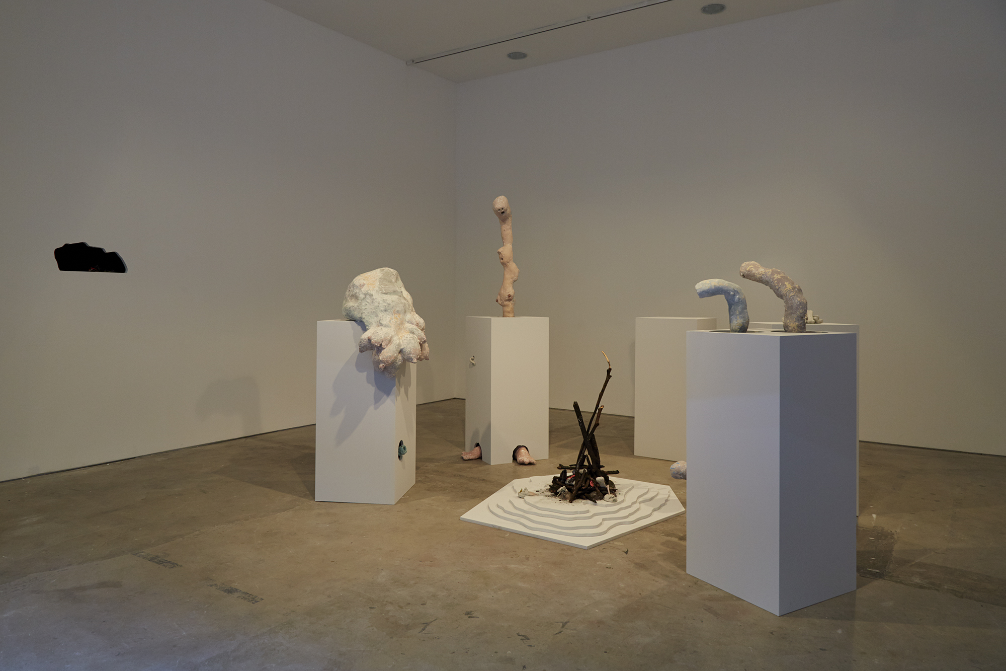 4K moving image with sound, rear projection inside the plinth, visible through a small hole. Sculpture located inside the plinth, visible through a larger hole